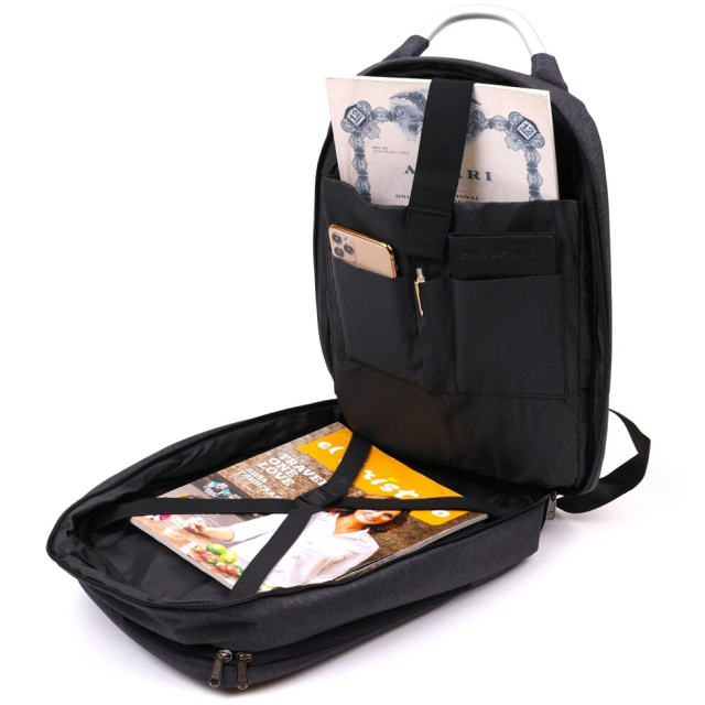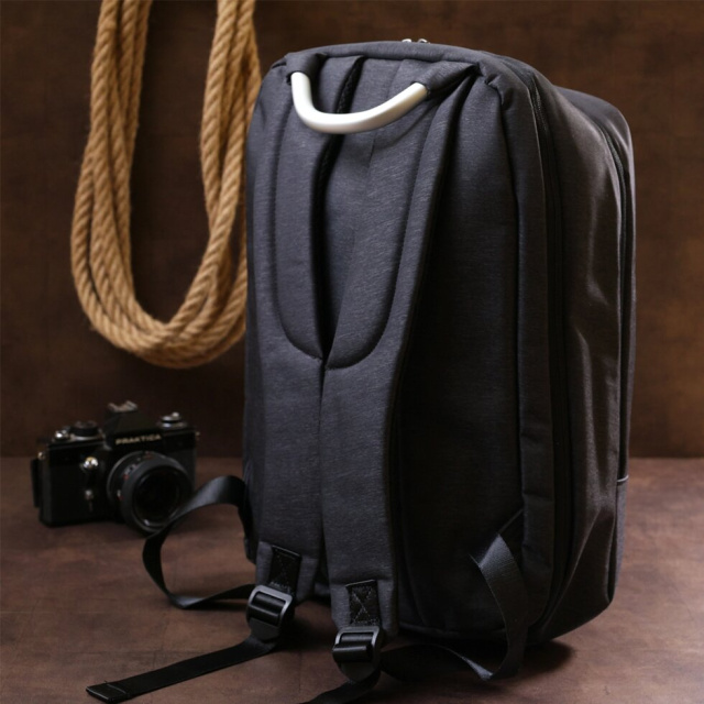 Текстильний чоловічий рюкзак у міському стилі з дуже практичним наповненням, яке представлене у вигляді двох містких відділень, кишені для ноутбука, для телефонів, ручки, сітчастої кишені та ін. із фіксатором. Виріб має гарне поєднання чорного та темно-сірого кольорів.