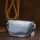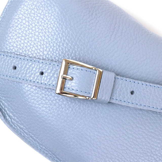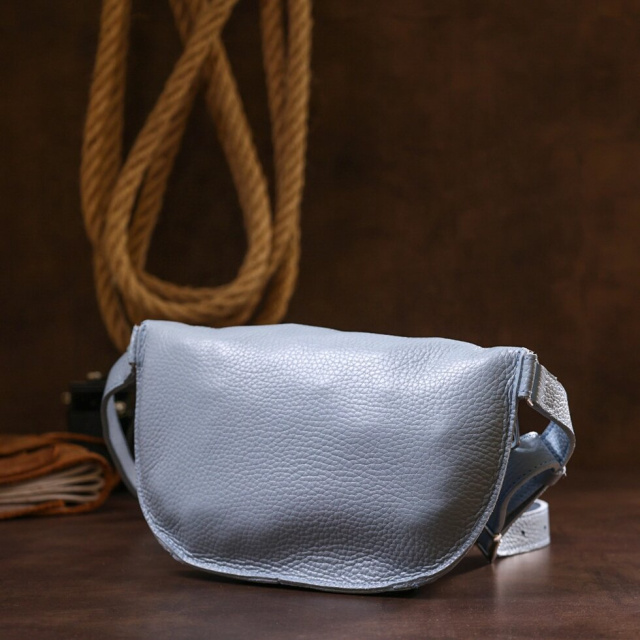 Стильна красива жіноча сумка на пояс у ніжному блідо-блакитному кольорі та зернистій фактурі. Матеріал виготовлення – натуральна шкіра з відмінними показниками міцності та стійкості до зношування. Фурнітура зроблена у кольорі під срібло. Ремінь виконаний також зі шкіри та може регулюватися по довжині. Така бананка стане гарним та практичним подарунком для близької людини.