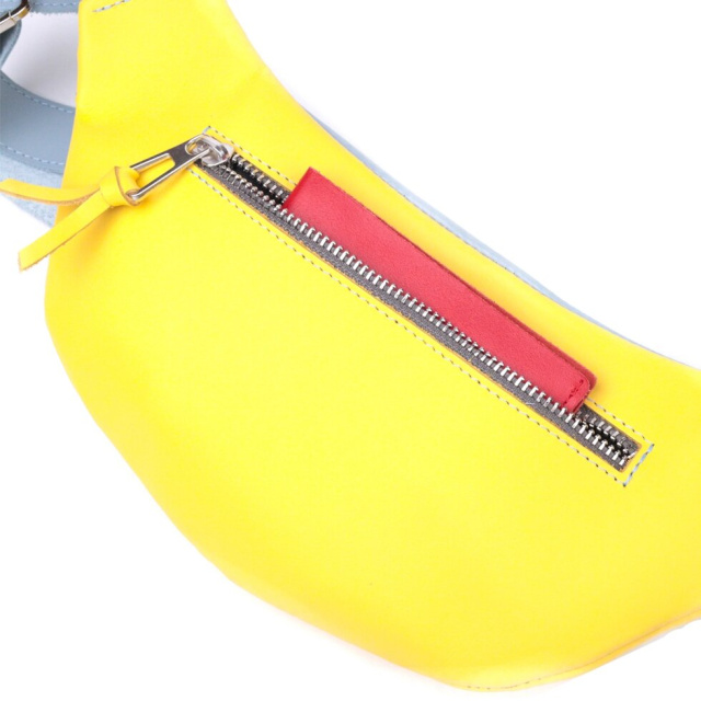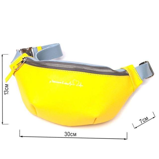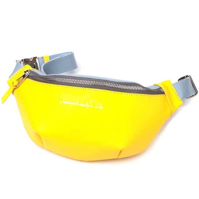 Патріотична сумка бананка для чоловіків та жінок з натуральної гладкої шкіри, у комбінації двох кольорів – жовтого та блакитного, та білим написом “З Україною в серці”. Поясна сумка бананка дуже функціональна і практична, з такою сумкою всі важливі речі будуть при вас і ваші руки будуть вільні. Ідеальний варіант сумки у дорогу. Бананку ви можете носити кількома способами на грудях, на поясі та на спині. Виріб стане чудовим подарунком для ваших близьких. У комплекті йде фетрова сумка чохол.