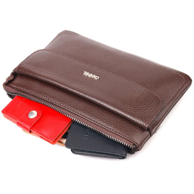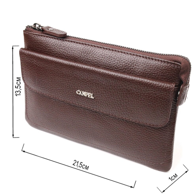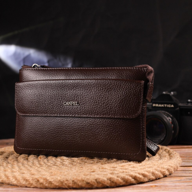 Місткий клатч для чоловіків з натуральної шкіри флотар. Аксесуар має одне основне відділення, всередині якого дві бічні кишені, відкритого та закритого типу та три осередки для кредитних карток. Зовні у виробі розташовані дві кишені, одна під клапаном на лицьовій стороні, інша на блискавці, на тильній стороні. Внизу аксесуара є ремінець для носіння на руці, що дуже зручно у використанні, також є кистьовий ремінь, що знімається. У барсетку ви можете покласти все необхідне і все буде під рукою.