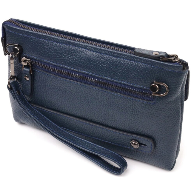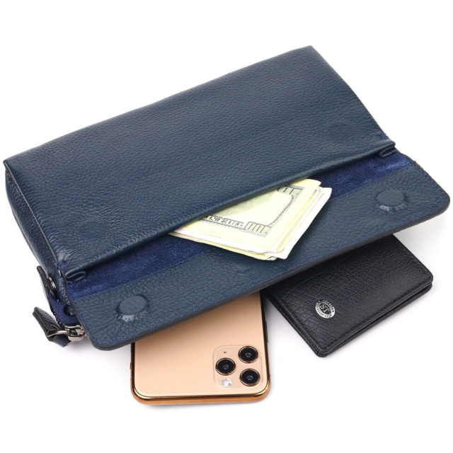 Чудовий клатч для чоловіків з натуральної шкіри флотар. Аксесуар має одне основне відділення, всередині якого дві бічні кишені, відкритого та закритого типу. Зовні у виробі розташовані дві кишені, одна під клапаном на лицьовій стороні, інша на блискавці, на тильній стороні. Внизу аксесуара є ремінець для носіння на руці, що дуже зручно у використанні, також є знімний кистьовий ремінь та знімний плечовий ремінь. Чим зручний клатч - у нього Ви можете покласти все необхідне і все буде під рукою.