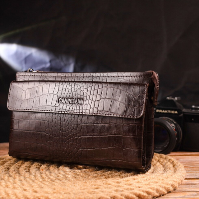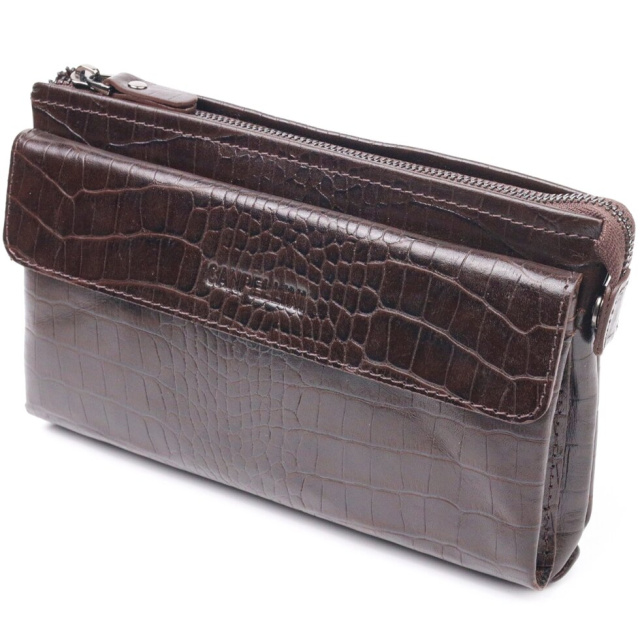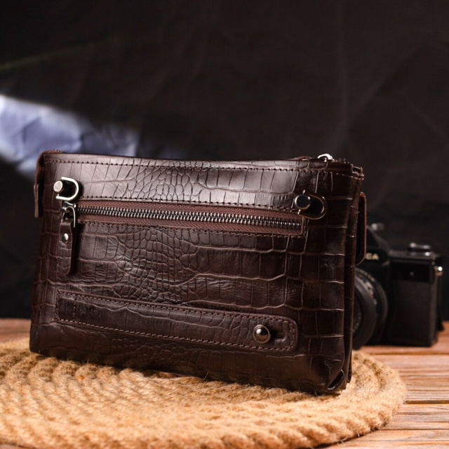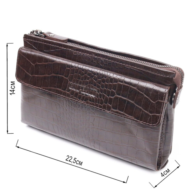 Популярний клатч для чоловіків із натуральної фактурної шкіри з тисненням під крокодила. Аксесуар має одне основне відділення, всередині якого дві бічні кишені, відкритого та закритого типу. Зовні у виробі розташовані дві кишені, одна під клапаном на лицьовій стороні, інша на блискавці, на тильній стороні. Внизу аксесуара є ремінець для носіння на руці, що дуже зручно у використанні, також є знімний кистьовий ремінь та знімний плечовий ремінь. Чим зручний клатч - у нього Ви можете покласти все необхідне і все буде під рукою.
