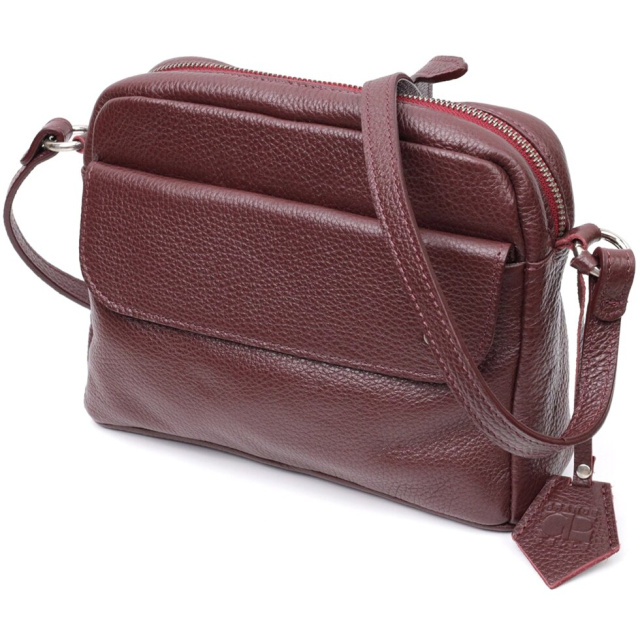 Стильна жіноча сумка через плече – хіт сезону. Аксесуар складається з основного відділення, що закривається на блискавку, кишені відкритого типу та кишені на блискавці всередині, зовнішньої кишені на блискавці, на тильній стороні та накладної кишені на лицьовій стороні, що закривається клапаном на магніти. Виконана з міцної та зносостійкої натуральної шкіри. Фурнітура срібного кольору, регульований шкіряний плечовий ремінь. Упакована ця сумка в гарний фірмовий чохол із ручками.