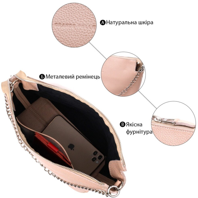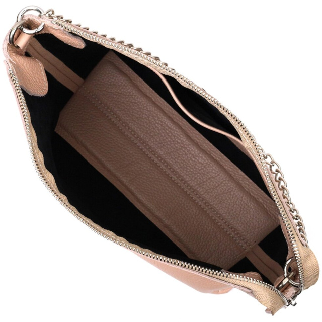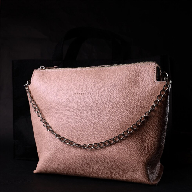 Люксова жіноча сумка із натуральної якісної шкіри. Аксесуар складається з основного відділення, що закривається на блискавку та кишені відкритого типу усередині. Виконана з міцної та зносостійкої натуральної шкіри. Носити цю сумку можна на плечі за допомогою регульованого текстильного ременя, а також в руках за допомогою ременя-ланцюжка, що знімається. Упакована ця сумка в гарний фірмовий чохол із ручками.