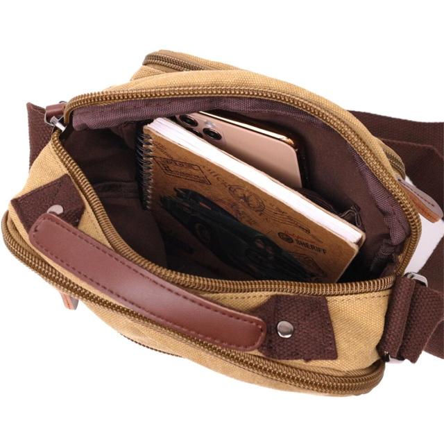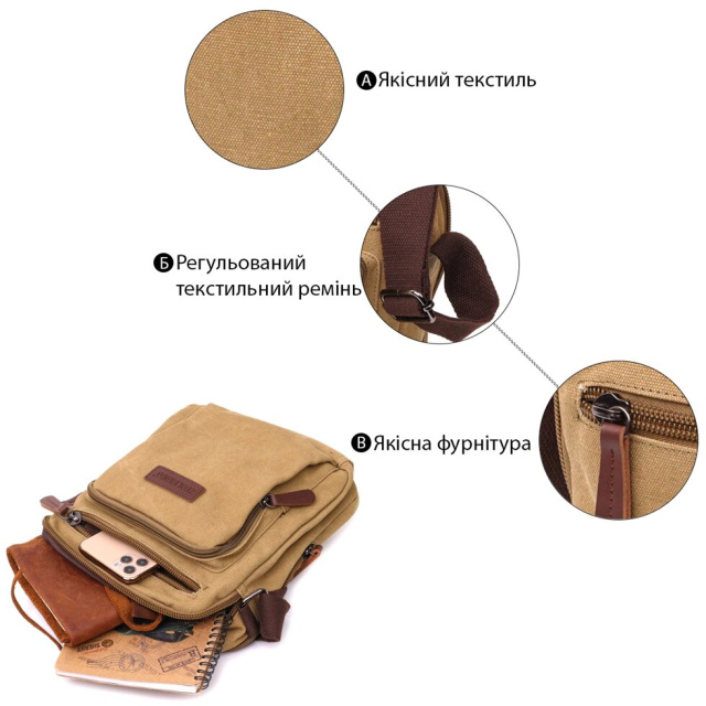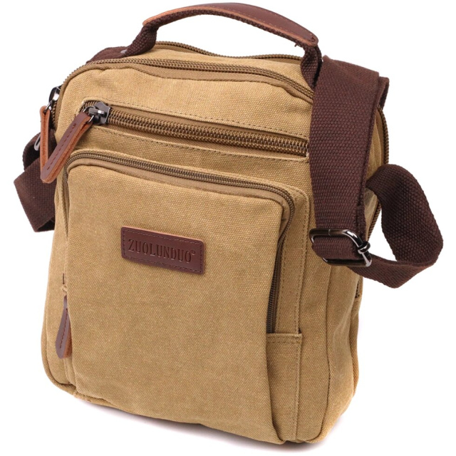 Практична чоловіча сумка із якісного щільного текстилю. Аксесуар має два основних відділення, внутрішні дві кишені на блискавці, та відкритого типу, і три зовнішні кишені на блискавках, різних розмірів. Сумку можна носити в руці, на плечі та через плече. У поєднанні з якісною фурнітурою та міцною підкладкою сумка прослужить Вам не один рік. Виріб стане чудовим подарунком для будь-якого чоловіка.