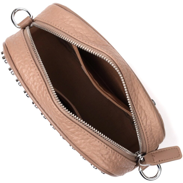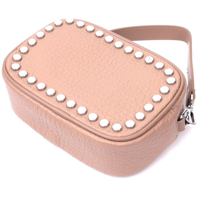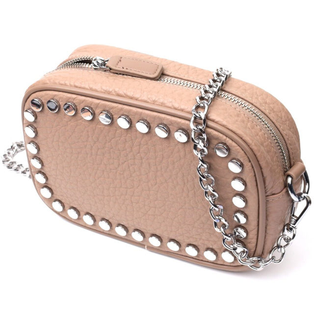 Цікава сумка жіноча з натуральної крупнозернистої шкіри, на лицьовій стороні, по краю, декорована кнопками у вигляді прямокутника. Аксесуар складається з одного основного відділення, потайної кишені на блискавці, кишені відкритого типу та кишені на блискавці зовні. Носити сумку можна в руках, на плечі і через плече, для цього є ручка для перенесення в руках і знімний ремінець з ланцюжком для переносу не плечі. У виробі використано надійну фурнітуру срібного кольору. Шкіряна сумка – найкращий подарунок для будь-якої дівчини.