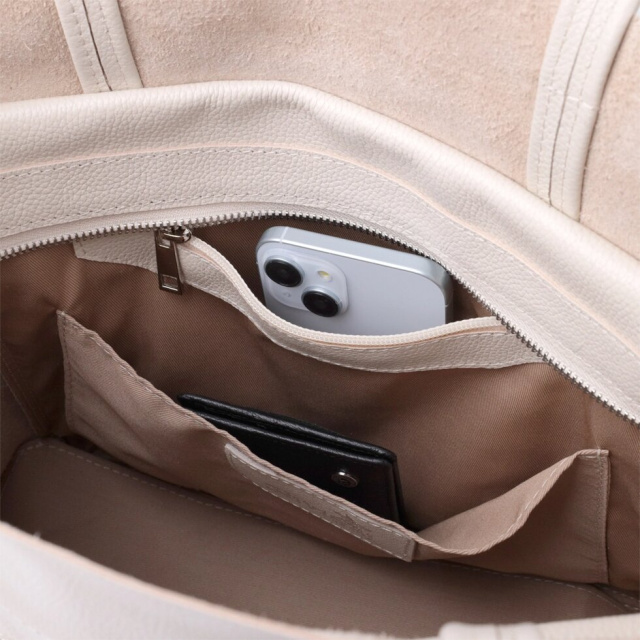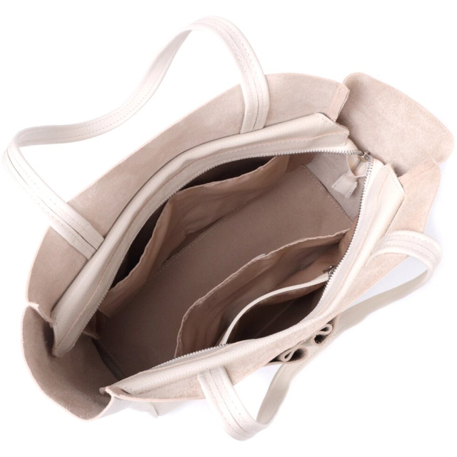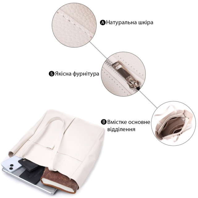 Ідеальна жіноча сумка для тих, хто завжди носить із собою величезну кількість речей. Таку сумку можна спокійно носити на роботу, в неї добре поміщаються всі особисті речі і папки з документами. Також таку модель зручно брати із собою у подорожі та виглядати завжди стильним та елегантним. Колір моделі – бежевий, фактура – зерниста. Матеріал виконання – натуральна шкіра з високими показниками стійкості до зношування. Для перенесення використовуються дві міцні надійні ручки. Сумка має знімне ущільнене дно прямокутної форми, щоб надати за бажанням більш чітких форм аксесуару. Фурнітура срібного кольору – стійка не змінює свій колір у процесі носіння. Аксесуар чудово поєднується з усіма стилями в одязі та може стати чудовим подарунком на будь-яке свято.