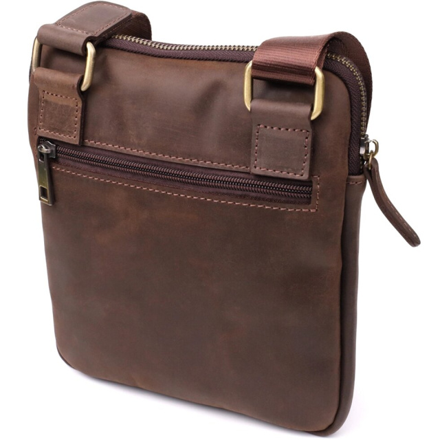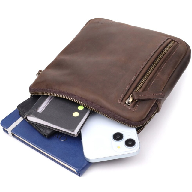 Стильна чоловіча вертикальна сумка SHVIGEL виконана з натуральної коричневої вінтажної шкіри, яка згодом набуває благородного відтінку та шарму. Компактний розмір та продумане внутрішнє наповнення роблять аксесуар практичним та зручним для повсякденного використання.