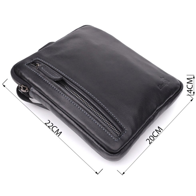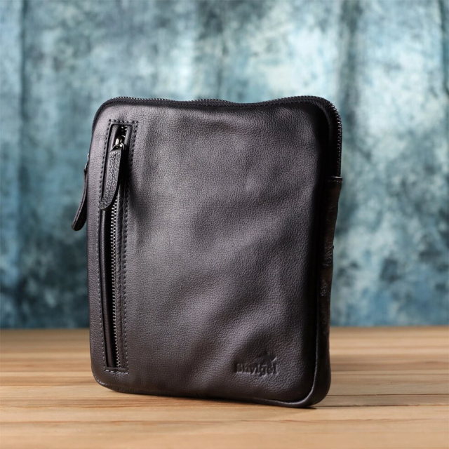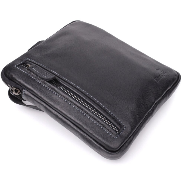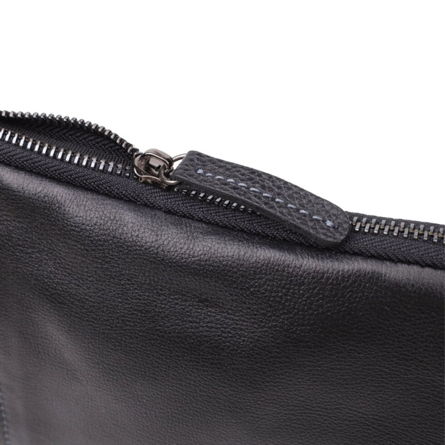 Ця чоловіча вертикальна сумка виготовлена з натуральної зернистої шкіри класичного чорного кольору. Завдяки міцній текстурі та акуратній обробці аксесуар виглядає стильно та універсально, легко поєднуючись із діловим та повсякденним чином.