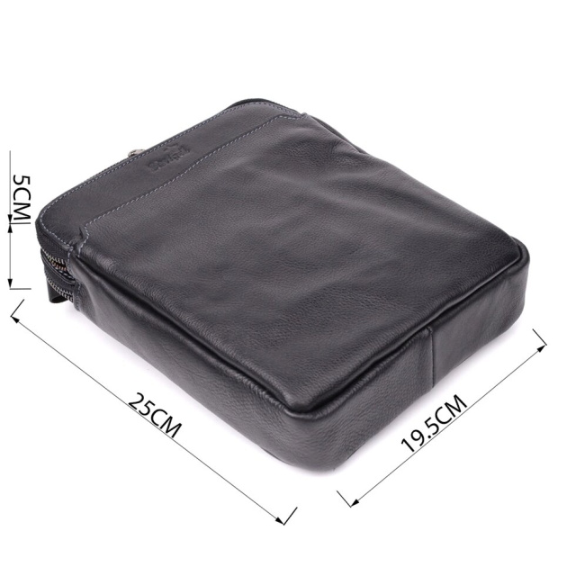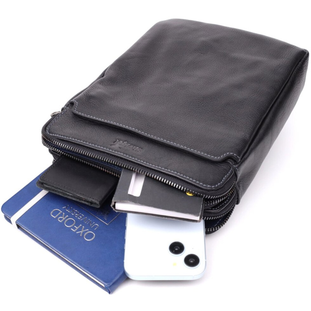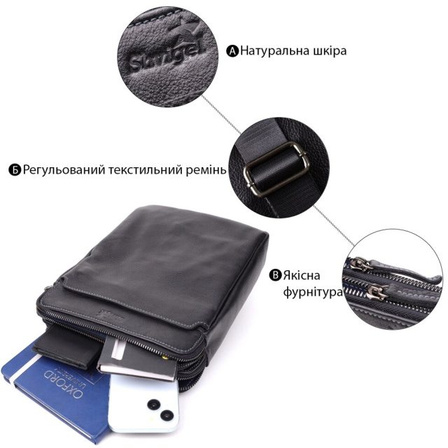 Чоловіча вертикальна сумка від українського бренду SHVIGEL виконана з натуральної чорної дрібнозернистої шкіри, яка поєднує міцність та вишуканий зовнішній вигляд. Компактні розміри та продумана організація внутрішнього простору дозволяють зручно розмістити документи, планшет чи особисті речі.