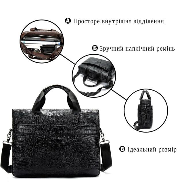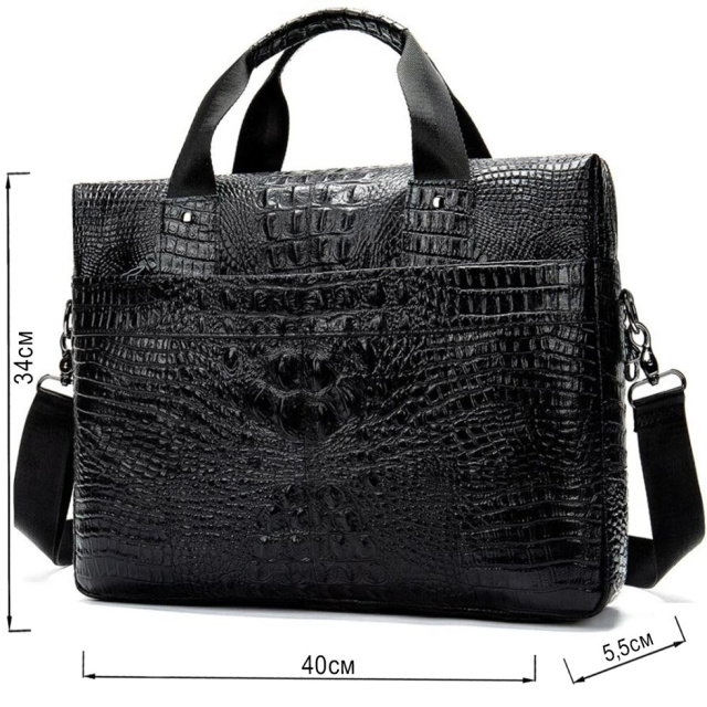 Солідна, якісна сумка з тисненням під крокодила з натуральної шкіри. У сумці зручно носити ноутбук, документи формату А4. Аксесуар прошитий чорною ниткою.
