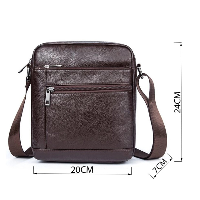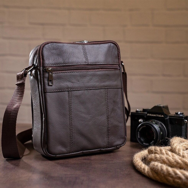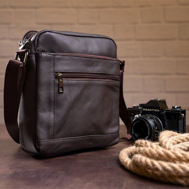 Стильна і одночасно компактна сумка для чоловіків. Підкреслить ваш статус в суспільстві і відмінне почуття стилю. Аксесуар чудово впишеться в ваш стиль. З такою сумкою у вас буде все найнеобхідніше на кожен день. Ідеальний варіант для тих, хто любить маленькі сумки. Дизайн аксесуара виконаний в класичному стилі. Модель прошита коричневою ниткою і доповнена сріблястою фурнітурою. Усередині сумки коричнева текстильна підкладка. Буде чудовим подарунком для будь-якого чоловіка. Купуючи таку сумку, ви будете здивовані, як вона довго вам прослужить. Аксесуар упакований в тканинний чохол.