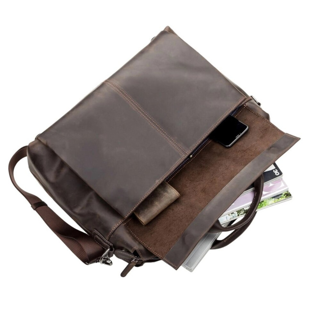 Вмістка дорожня сумка (м'яка) на двох ручках для людей, які часто відправляються в ділові поїздки. Аксесуар виконаний з натуральної вінтажної шкіри, характерними ознаками якої є: неоднорідність забарвлення і потертості, які надають виробу вишуканого, індивідуального виду. Колір фурнітури: темне срібло.