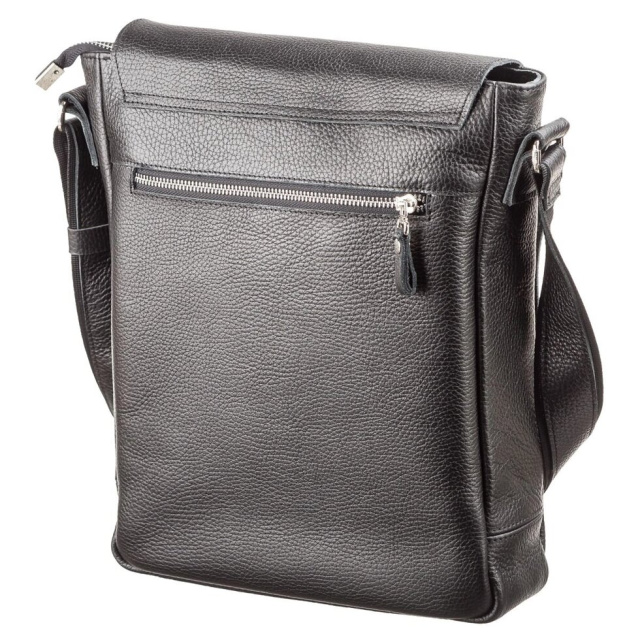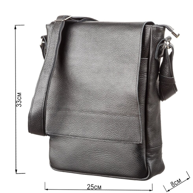 Надійна чоловіча сумка з натуральної зернистої шкіри. Колір фурнітури: срібло. У такий аксесуар з легкістю поміщаються документи формату А4, тому його можна рекомендувати сучасній діловій людині. Таку сумку можна носити як під джинси, так і під класичний костюм.