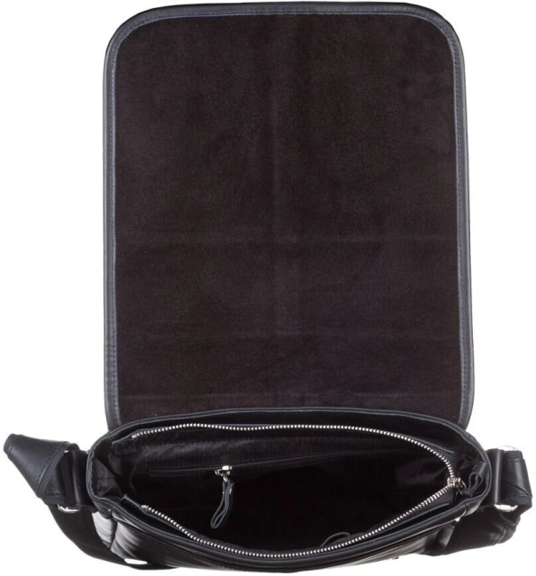 Зручна шкіряна чоловіча сумка високої якості. Виріб виконаний зі шкіри чорного кольору. Шкіра добротна, приємна на дотик. Колір фурнітури: срібло. Сумка акуратно прошита надміцною ниткою чорного кольору. На задній зовнішній стороні аксесуара розташоване відділення на блискавці. Дана модель носитися через плече. Плечовий ремінь виконаний в комбінації натуральної шкіри і міцного текстильного матеріалу. Сумка закривається за допомогою клапана і 2-х шкіряних хлястиків на магнітних кнопках, а також блискавкою. Під клапаном знаходиться містка накладна кишеня. Підкладка виконана з міцного текстильного матеріалу чорного кольору.