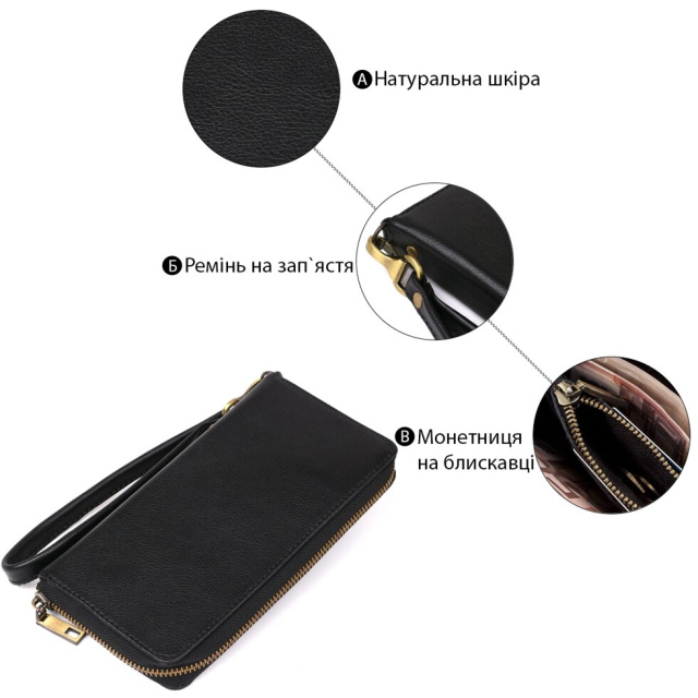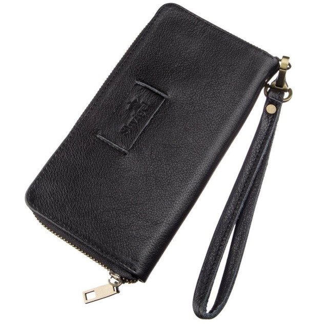 Шкіряний чоловічий клатч-барсетка зі знімним ремінцем. Клатч дуже місткий і має просторі відділення. Класичний чорний колір підійде під будь-який гардероб, так як є найоптимальнішим. Виріб доповнено міцною фурнітурою з якісного металу. На лицьовій стороні виробу тиснений логотип бренду. Ви також можете використовувати клатч замість барсетки для ваших документів. Якщо ви шукаєте подарунок для чоловіка - клатч стане для нього найкращим і практичним подарунком.