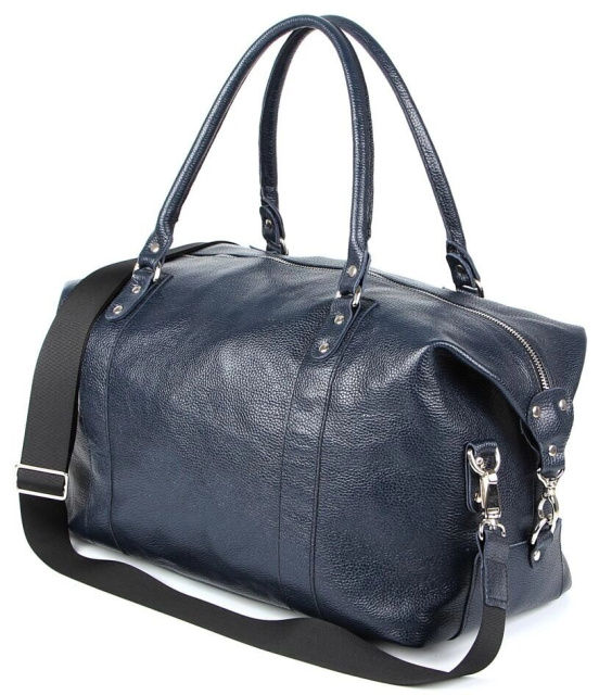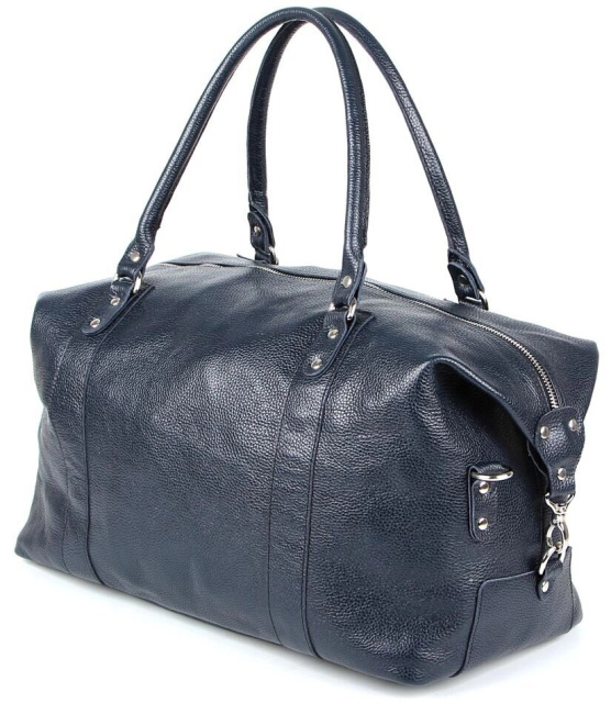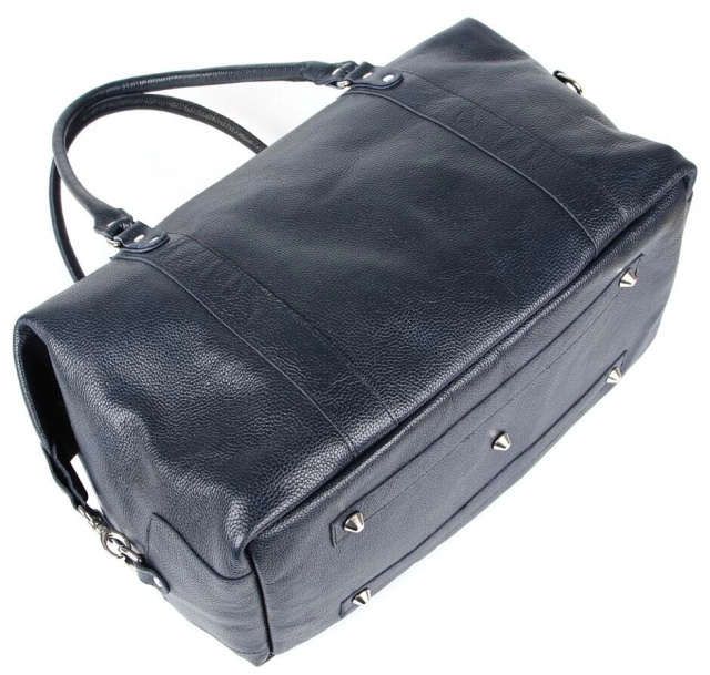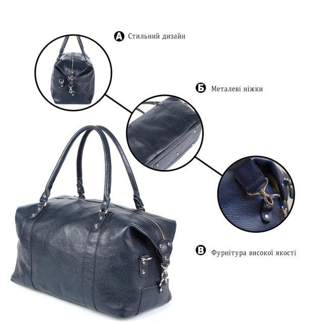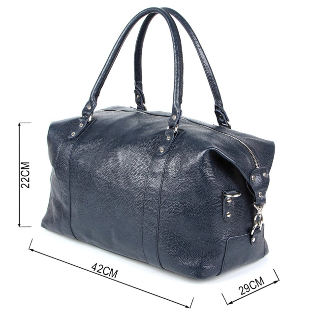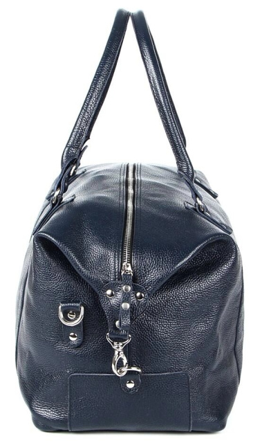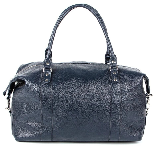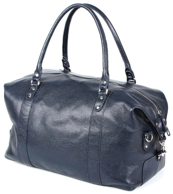Ексклюзивна дорожня сумка з натуральної шкіри із "зернистою" фактурою. Аксесуар виконаний в темно-синьому кольорі. Колір фурнітури: срібло. Вмісткості такої сумки буде досить для походу в спортзал або нетривалого відрядження. Аксесуар виглядає дуже красиво і дорого, тому він може бути чудовим рішенням для подарунка. Дно сумки захищене металевими ніжками. Виріб упаковано в текстильний пилозахисний чохол.