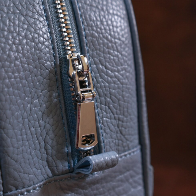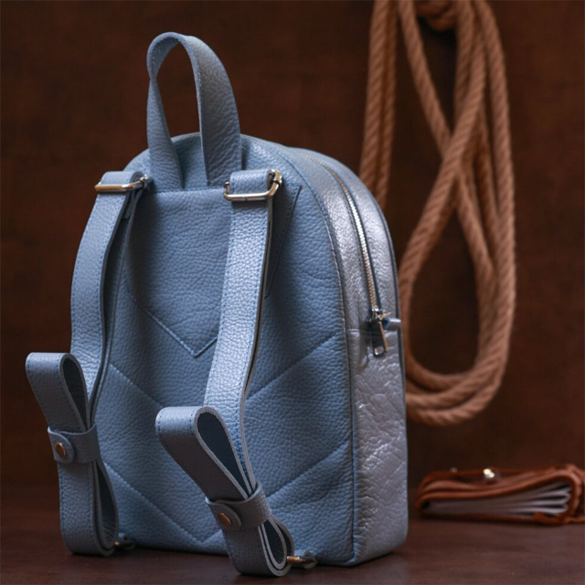 Компактний жіночий рюкзак від українського виробника для поціновувачів простого та акуратного дизайну без надмірностей. Матеріал виготовлення – натуральна шкіра високої якості з відмінними характеристиками. Колір виробу – блідо-блакитний, що виглядає красиво та по-літньому свіжо, фактура – зерниста. Шлейки регулюються по довжині та виконані також з натуральної шкіри.