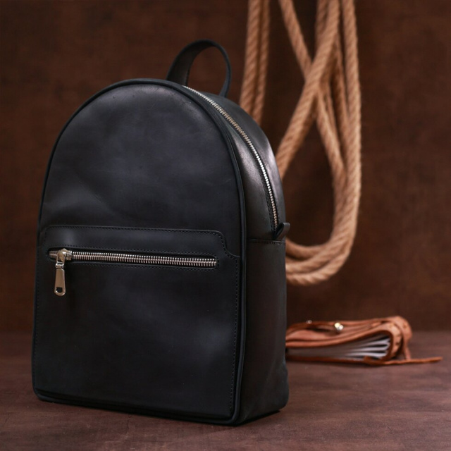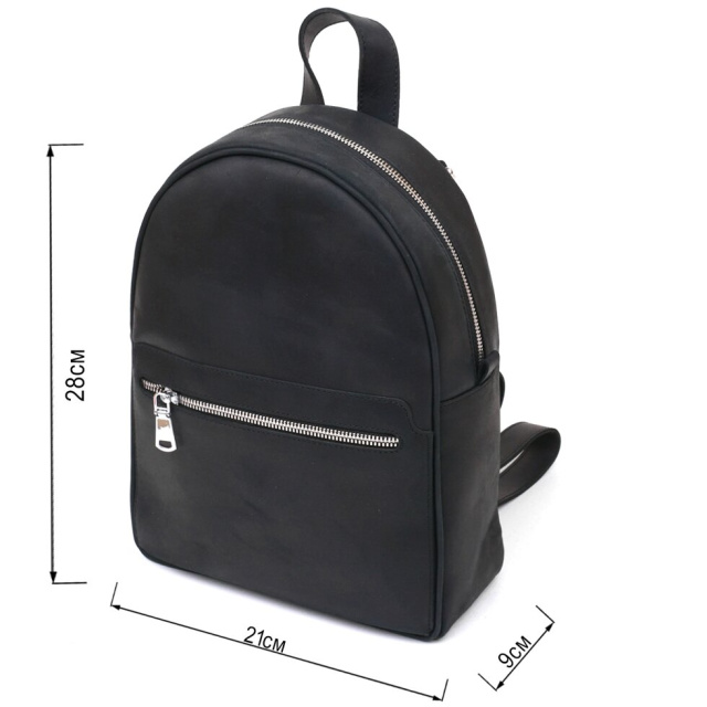 Практичний невеликий жіночий рюкзак у стильному та модному дизайні від українського виробника. Виконано цю модель з натуральної високоякісної шкіри з покращеними показниками стійкості до зносу. Колір - універсальний чорний, що практично, фактура - гладка матова з вінтажними нотками.