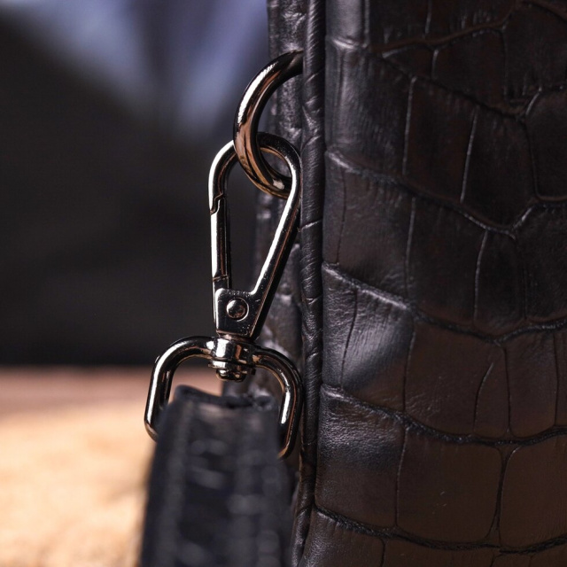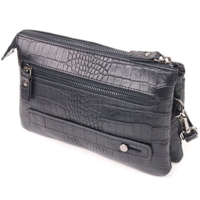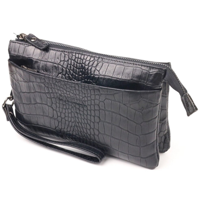 Надійний клатч для чоловіків з натуральної якісної шкіри з тисненням під крокодила. Аксесуар має одне основне відділення, всередині якого дві кишені на блискавках і два осередки для кредитних карток. Зовні у виробі розташовані дві кишені на лицьовій та тильній стороні, що закриваються на блискавку. Внизу аксесуара є ремінець для носіння на руці, що дуже зручно у використанні, також є кистьовий ремінь, що знімається. Чим зручний клатч - у нього Ви можете покласти все необхідне і все буде під рукою.