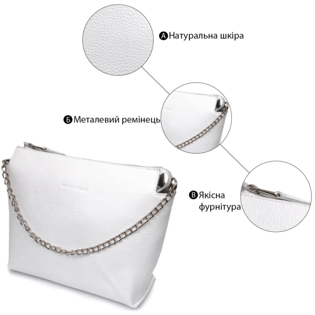 Відмінна жіноча сумка із натуральної якісної шкіри. Аксесуар складається з основного відділення, що закривається на блискавку та кишені відкритого типу усередині. Виконана з міцної та зносостійкої натуральної шкіри. Носити цю сумку можна на плечі за допомогою регульованого текстильного ременя, а також в руках за допомогою ременя-ланцюжка, що знімається. Упакована ця сумка в гарний фірмовий чохол із ручками.