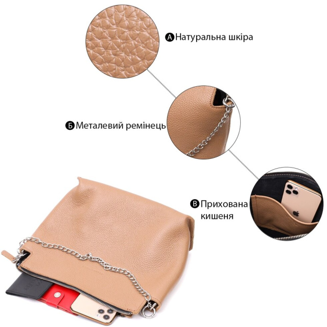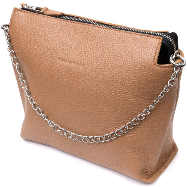Оригінальна жіноча сумка із натуральної якісної шкіри. Аксесуар складається з основного відділення, що закривається на блискавку та кишені відкритого типу усередині. Виконана з міцної та зносостійкої натуральної шкіри. Носити цю сумку можна на плечі за допомогою регульованого текстильного ременя, а також в руках за допомогою ременя-ланцюжка, що знімається. Упакована ця сумка в гарний фірмовий чохол із ручками.