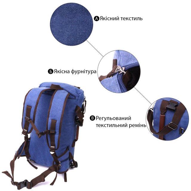Місткий рюкзак трансформер із щільного текстилю. Модель можна носити як сумку, і рюкзак. Аксесуар має бічні регулятори і може розширюватися обсяг залежно від забитости сумки. Виріб має достатній об'єм кишень, щоб Ви легко помістили всі свої особисті речі. Сумка виконана з якісного та міцного текстилю. Виріб стане гідною заміною, якщо ви не бажаєте переплачувати за моделі з натуральної шкіри.
