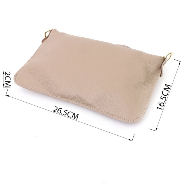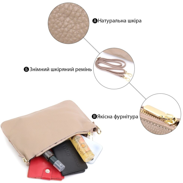 Жіноча функціональна сумка-клатч із натуральної шкіри. Аксесуар складається з основного відділення, що закривається на блискавку, кишені-перегородки на блискавці всередині та кишені на блискавці на тильній стороні, зовні. Носити сумку можна на плечі і через плече, також можна носити як клатч під рукою і на кисті, для цього є довгий ремінець, що знімається, а також знімний кистьовий ремінь.