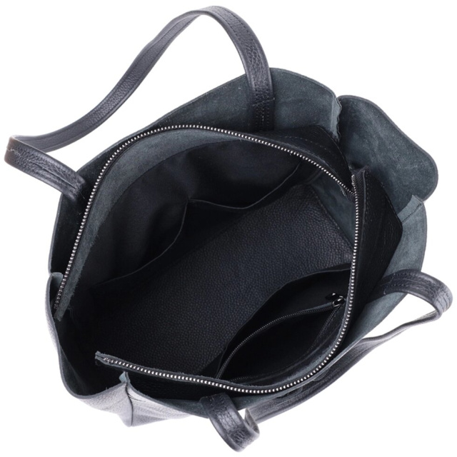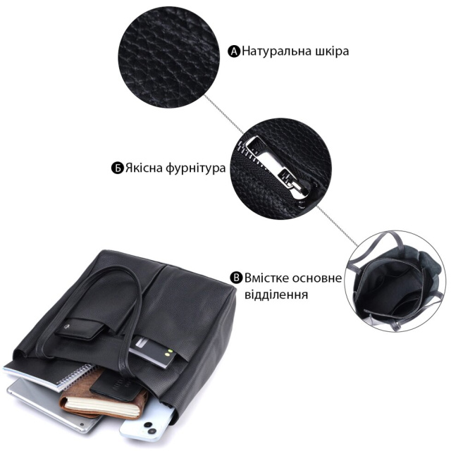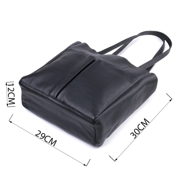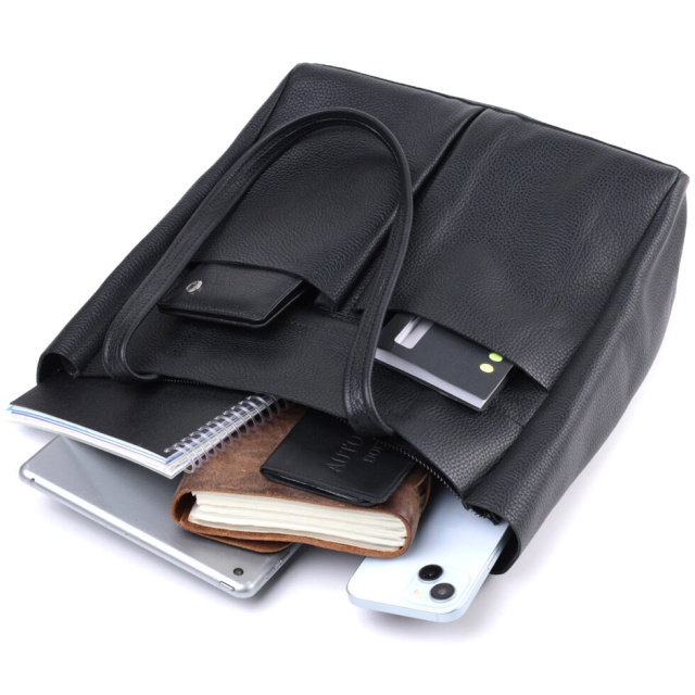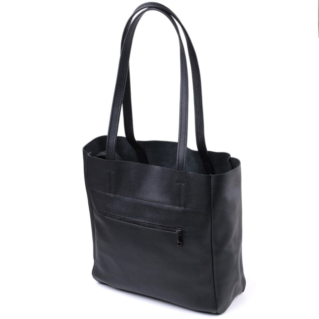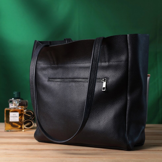 Функціональна жіноча сумка для тих, хто завжди носить із собою величезну кількість речей. Таку сумку можна спокійно носити на роботу, в неї добре поміщаються всі особисті речі і папки з документами. Також таку модель зручно брати із собою у подорожі та виглядати завжди стильним та елегантним. Колір моделі – чорний, фактура – зерниста. Матеріал виконання – натуральна шкіра з високими показниками стійкості до зношування. Для перенесення використовуються дві міцні надійні ручки. Сумка має знімне ущільнене дно прямокутної форми, щоб надати за бажанням більш чітких форм аксесуару. Фурнітура срібного кольору – стійка не змінює свій колір у процесі носіння. Аксесуар чудово поєднується з усіма стилями в одязі та може стати чудовим подарунком на будь-яке свято.