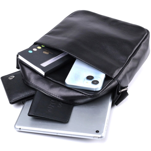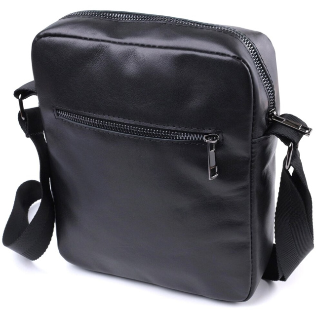 Практична чоловіча сумка месенджер, в яку помістяться всі ваші необхідні речі. Фурнітура металевого кольору - стійка не змінює свій колір у процесі носіння. Чудова чоловіча сумка вертикального формату виготовлена з натуральної гладкої шкіри чорного кольору. Аксесуар чудово поєднується з усіма стилями в одязі та може стати чудовим подарунком на будь-яке свято.