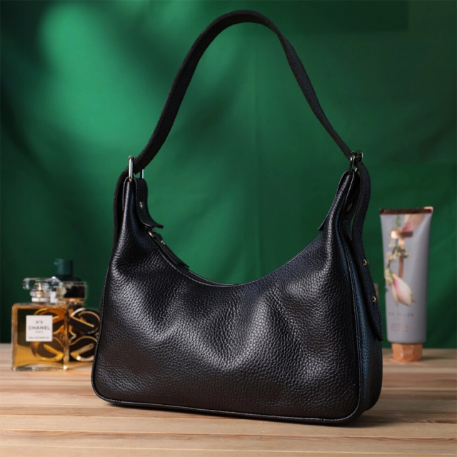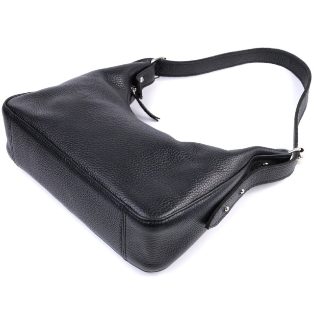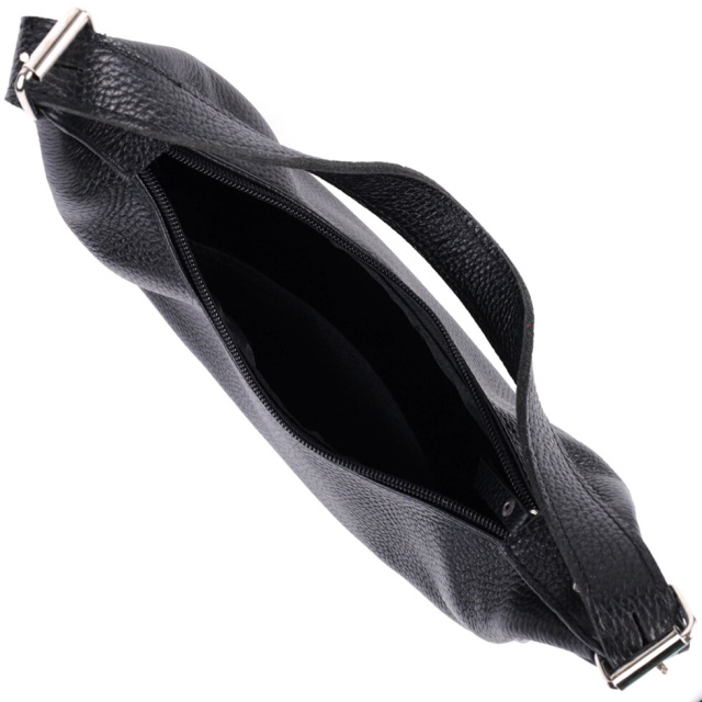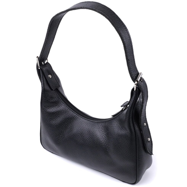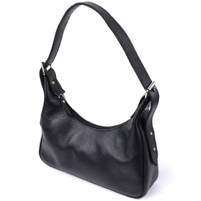 Стильна сумка для тих, хто любить красивий дизайн без зайвих деталей. Це невелика сумка з коротким ременем, яку зручно носити під рукою, вона набула своєї популярності завдяки своєму універсальному дизайну та незвичайній формі. Така сумка у модному світі має назву – сумка багет. Колір виробу – класичний чорний, фактура – зерниста. Матеріал виконання – натуральна шкіра з високими показниками якості. Відмінний варіант сумки на кожен день, адже вона не тільки приваблива зовні, але й оснащена розумною системою внутрішніх відділень, що дозволить організувати простір усередині. Модель виготовлена з якісних матеріалів та добре тримає форму.