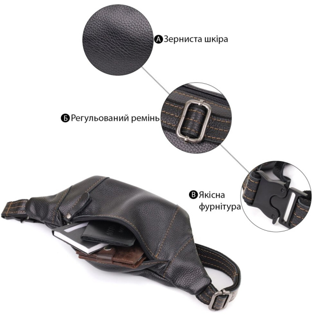Сумка-бананка Shvigel у чорній зернистій шкірі – це не просто аксесуар, а відображення характеру, смаку та впевненості. Відмінний варіант як для себе, так і подарунок.
