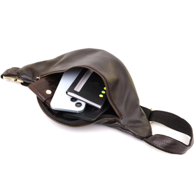 Цікава сумка-бананка для чоловіків від українського бренду Shvigel – вдале поєднання практичності, стилю та індивідуальності. Виконана з міцної натуральної гладкої шкіри у коричневому кольорі, який надає аксесуару свіжості та шляхетності, підкреслюючи вашу оригінальність та впевненість у собі.