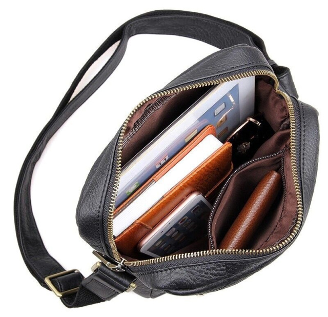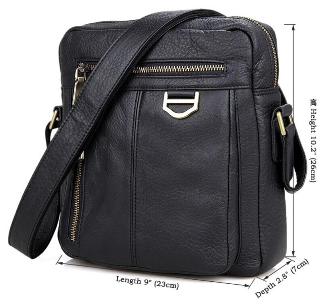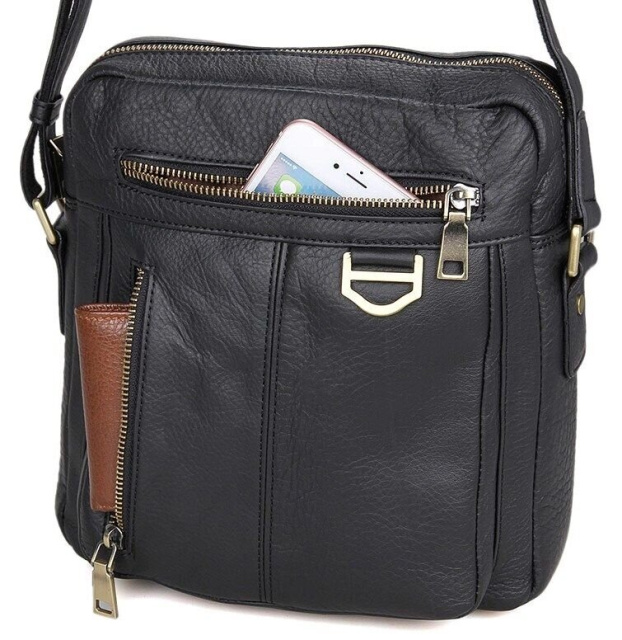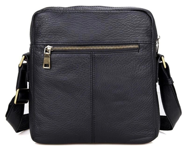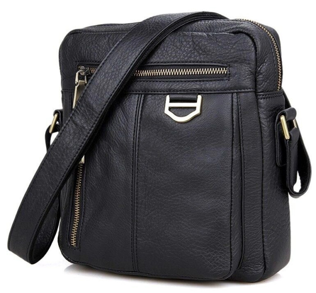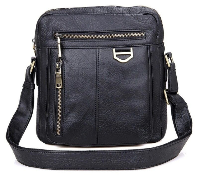 Добротна чоловіча сумка через плече з натуральної шкіри. Колір фурнітури: латунь. Сумка акуратно прошита міцною ниткою чорного кольору. На лицевій стороні розташовано два відділення на блискавці. Ще одне відділення на блискавці розташоване на задній зовнішній стороні. Дана модель закривається за допомогою блискавки. Сумка упакована в текстильний пилозахисний чохол білого кольору.