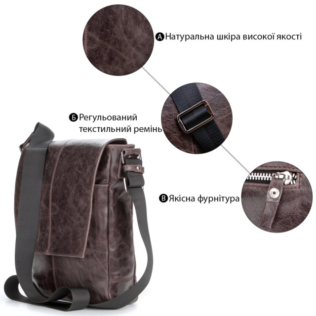 Аксесуари ручної роботи дуже цінуються у всьому світі, оскільки вони унікальні і оригінальні, такі, як ця чудова модель сумки. Вона виготовлена з міцної натуральної шкіри у вінтажній обробці і виглядає стильно і добротно.