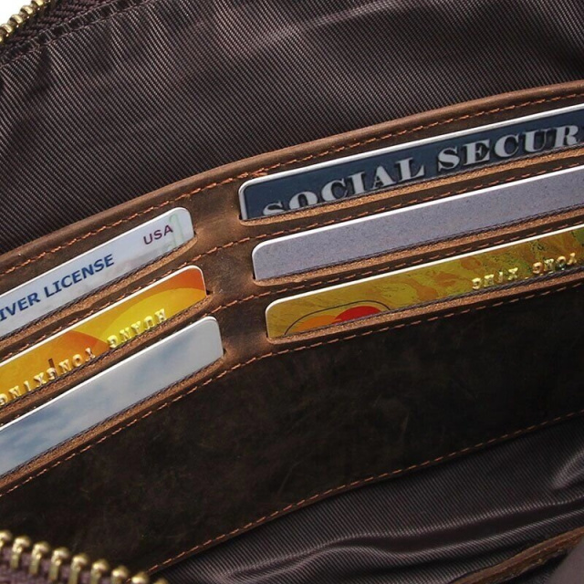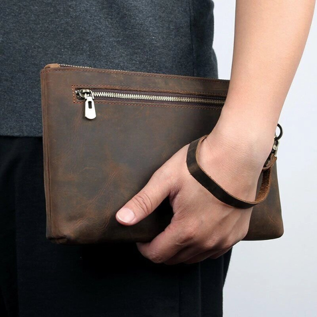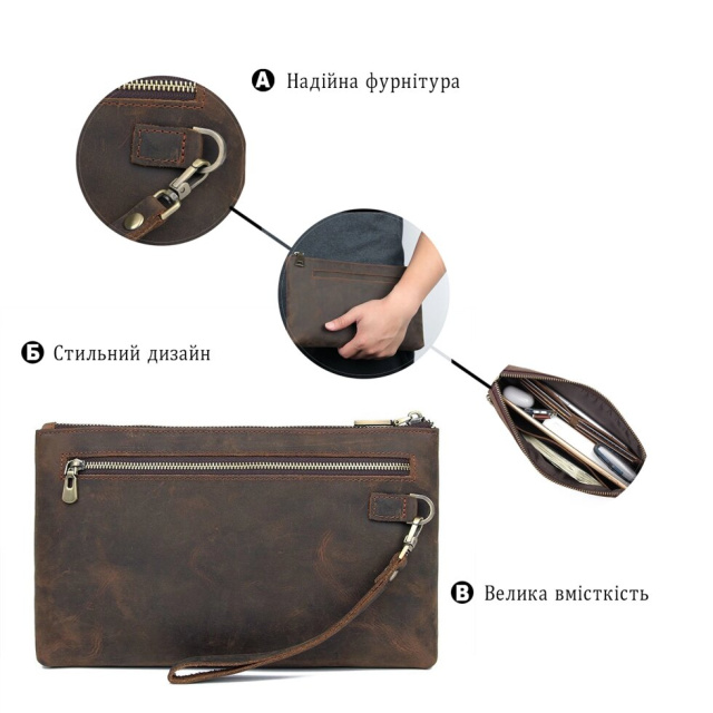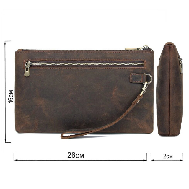 Солідна чоловіча барсетка зроблена з натуральної винтажної шкіри. Особливістю такої шкіри, є те, що з часом вона виглядає ще більш ефектно. На шкірі в процесі експлуатації з'являються подряпини і потертості, які і надають їй ефект старовини за який люблять її наші клієнти. З такою барсеткою ваш образ буде більш завершеним і доповненим. Аксесуар буде прекрасним подарунком для близької людини.