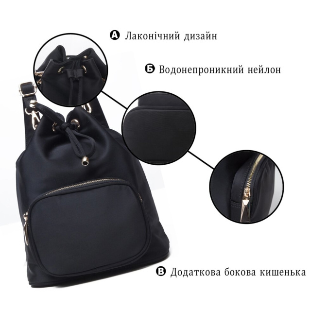Сучасний жіночий рюкзак компактного розміру на кожен день. Аксесуар має оригінальний класичний дизайн, який не прив'язує вас до певного стилю. Модель доповнена блискучою золотистою фурнітурою і дуже приємна на дотик. В аксесуар легко поміститься косметичка, гроші, щоденник або улюблена книга, а також інші необхідні жіночі дрібниці. Дуже хороша модель на кожен день. Рюкзак виконаний з щільного нейлону і прослужить вам порівняно довго. Незважаючи на свій невеликий розмір аксесуар дуже вмісткий і зручний. Рюкзак буде ідеальним подарунком для будь-якої дівчини.
