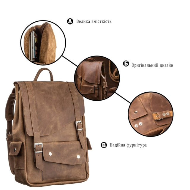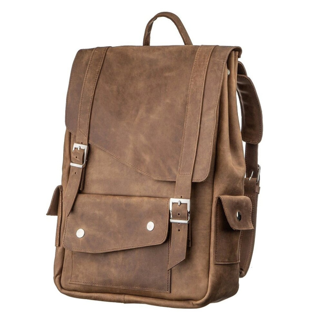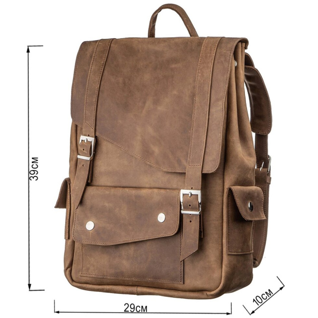 Зручний вінтажний рюкзак як для міста, так і для подорожі. У такий рюкзак ви можете вмістити з собою ноутбук. Варто звернути увагу, що в моделі відсутня підкладка. Всередині рюкзака тильна сторона шкіри. Аксесуар доповнено сріблястою фурнітурою в дизайн. Рюкзак приємний на дотик. Надійно прошитий міцною ниткою в темних тонах, яка надає аксесуару родзинку. Шкіра, з якої виконаний рюкзак користується особливою популярністю серед багатьох клієнтів. Її обирають за зовнішній вигляд, який змінюється в кращу сторону в процесі експлуатації, покриваючись розкішними потертостями. Ви можете самостійно регулювати наповненість рюкзака за допомогою ремінців і кнопок в моделі.
