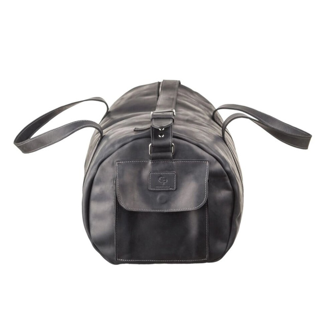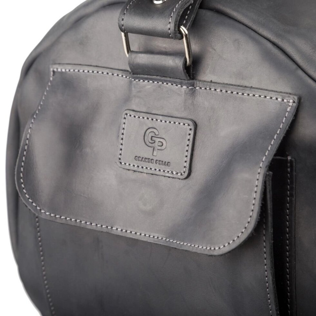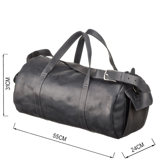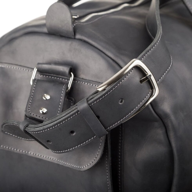 Міцна чорна дорожня сумка виконана виключно з цільної товстої, якісної, вінтажної шкіри, характерними ознаками якої є: неоднорідність забарвлення і потертості, які надають виробу вишуканого, індивідуального виду. Сумка поєднує в собі мінімалізм і функціональність. Вся фурнітура вищої якості, в сумці немає картону, немає підкладкових тканин, форма вироби зберігається завдяки пружності самої цільної шкіри. Завдяки цьому виріб має високу зносостійкість і благородний зовнішній вигляд.