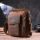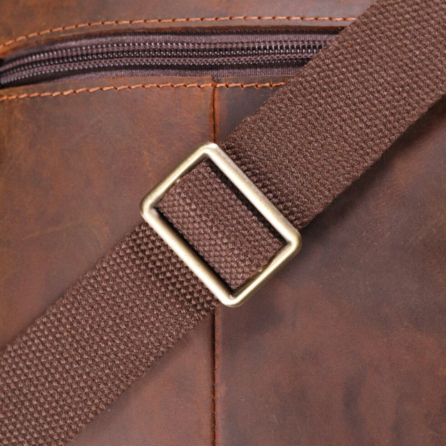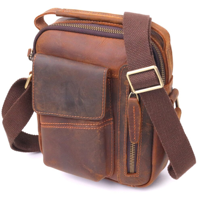 Практична чоловіча сумка з натуральної вінтажної шкіри з відмінними характеристиками якості та зносостійкості. Аксесуар має містке основне відділення та додаткові кишені для речей, які мають бути швидко доступними. Плечовий ремінь можна регулювати по довжині, виконаний він із міцного текстилю. Колір фурнітури жовтий. Шкіряна сумка, завжди була чудовим подарунком для рідних та близьких людей.