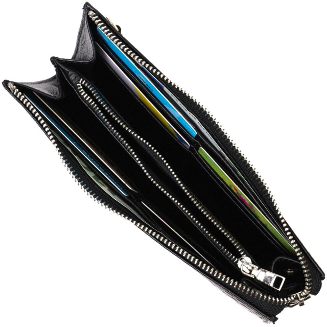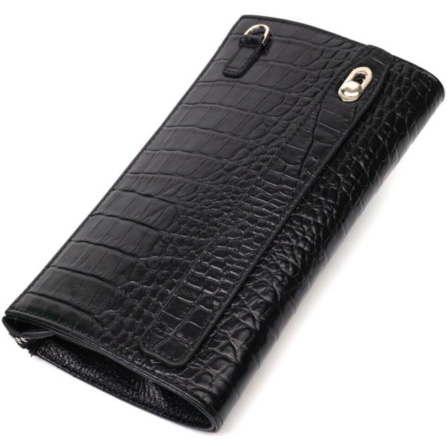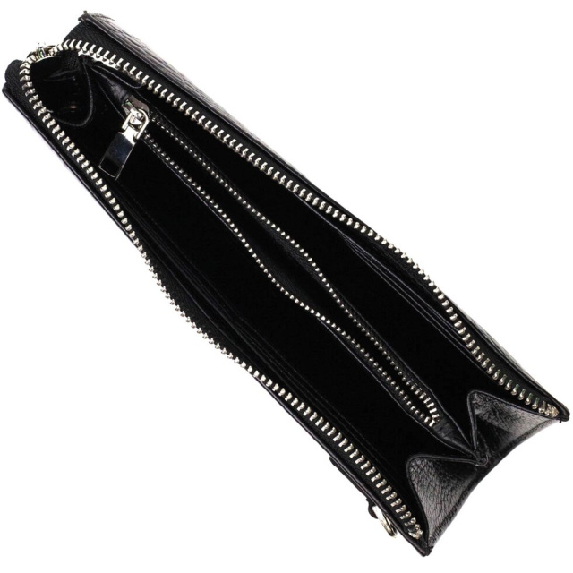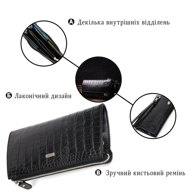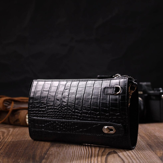Унікальний чоловічий клатч із натуральної якісної шкіри з тисненням під крокодила, закривається виріб на блискавку, всередині можна без проблем розміщувати паперові банкноти, банківські картки та навіть смартфон. Аксесуар складається з двох відділень для купюр, двох прилеглих кишень, дванадцяти слотів для кредиток та монетниці на блискавці. Є також ручка для долоні на тильній стороні клатчу та знімний кистьовий ремінь. Продається клатч у красивій коробці від виробника. Якісний і надійний клатч - саме такий аксесуар повинен бути у кожної людини, що поважає себе.