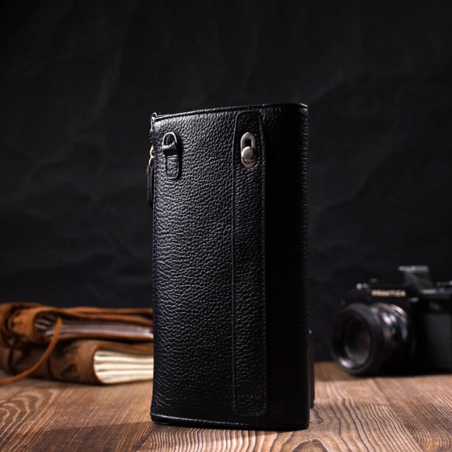 Універсальний чоловічий клатч із натуральної якісної шкіри, закривається виріб на блискавку, всередині можна без проблем розміщувати паперові банкноти, банківські картки та навіть смартфон. Аксесуар складається з двох відділень для купюр, двох прилеглих кишень, дванадцяти слотів для кредиток та монетниці на блискавці. Є також ручка для долоні на тильній стороні клатчу та знімний кистьовий ремінь. Продається клатч у красивій коробці від виробника. Якісний і надійний клатч - саме такий аксесуар повинен бути у кожної людини, що поважає себе.