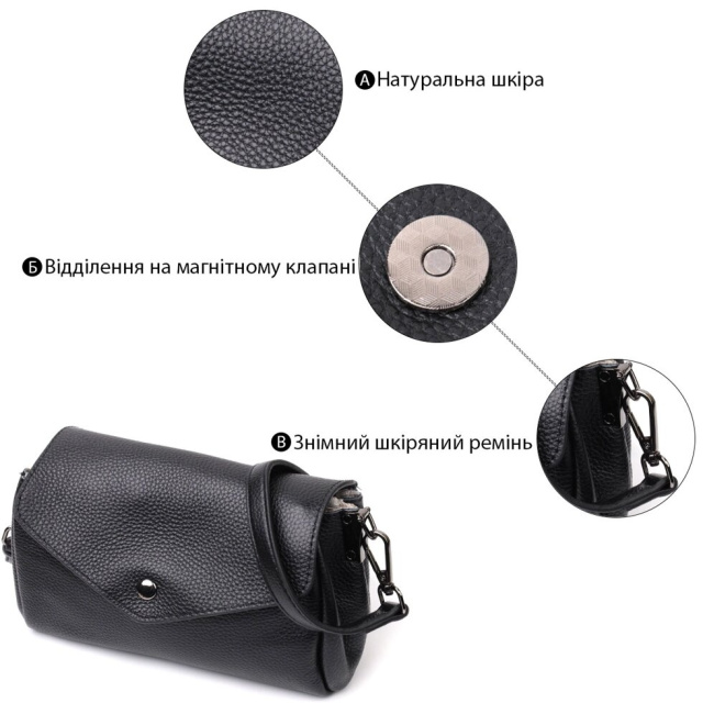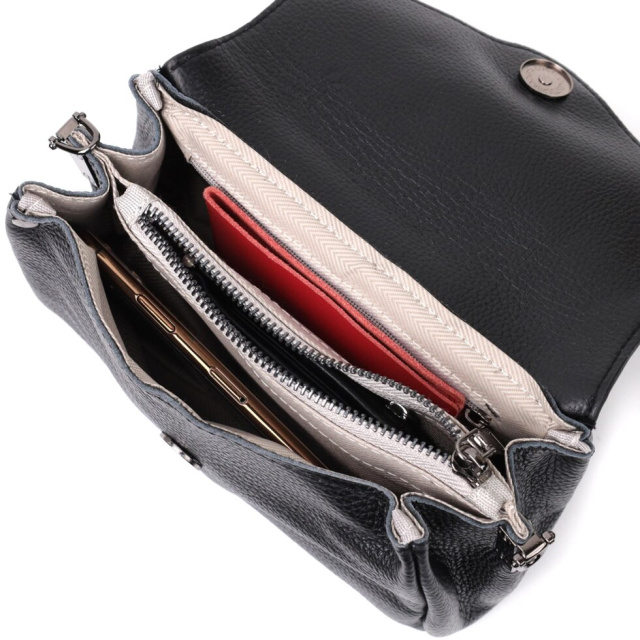 Компактна жіноча сумка з м'якої добротної шкіри, яка чудово носиться і не втрачає свого первісного вигляду. Аксесуар складається з одного основного відділення в якому всередині дві кишені на блискавках. Носити сумку можна в руках, на плечі і через плече, для цього є шкіряний ремінь, що знімається. У виробі використано якісну фурнітуру кольору темного срібла. Універсальний варіант сумки як на вечір так і як сумочка на кожен день.