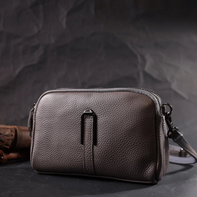 Зручна сумка для жінок невеликого розміру на два автономні відділення з натуральної шкіри флотар, яка невибаглива у догляді та довго носиться. Аксесуар складається з двох автономних відділень, кишені відкритого типу, потайної кишені на блискавці та зовнішньої кишені на блискавці, що знаходиться на тильній стороні. Носити сумку можна в руці, на зап'ясті для цього передбачений шкіряний кистьовий ремінь, що знімається, а також на плечі і через плече, для цього є шкіряний знімний ремінь. В аксесуарі використано якісну фурнітуру кольору срібла. Відмінний варіант сумки для жінок, які люблять якісні та стильні речі.