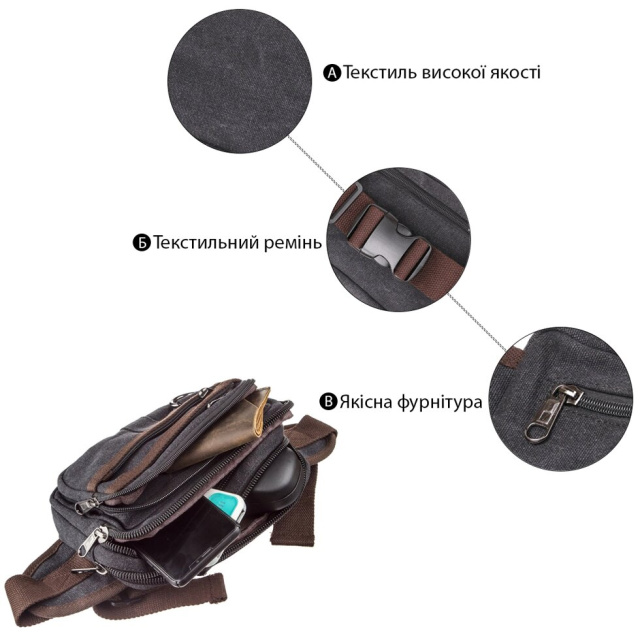 Найзручніша сумка на всі сезони - це сумка на пояс. Модель йде в самому універсальному чорному кольорі. Сумка стала просто знахідкою для водіїв і мандрівників. Бананка захистить ваші особисті речі, не займає багато місця і не обтяжує вас зайвим навантаженням. Всі ваші особисті речі з такою сумкою будуть у вас перед очима. При необхідності сумку дуже легко прати. Доступна вартість сумки робить її ще більш популярною. Виріб виконаний з якісного текстилю та доповнено міцної фурнітурою і щільною підкладкою. Ви можете носити сумку на поясі, на спині і через плече на груди. Ми впевнені, що купивши таку сумку, ви вмить оціните всі її зручності.