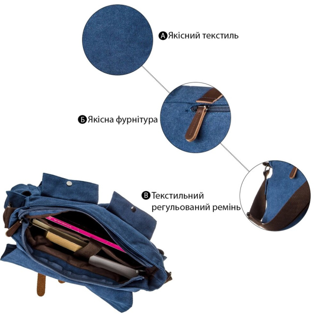 Практична текстильна сумка для ноутбука, навчання або роботи. Сумка виконана з міцного текстилю. Модель легко стирається і не вимагає особливого догляду. Сумка дуже легка і її зручно носити на плечі. Аксесуар має різноманітні кишеньки для вашої зручності. Всередині - якісна текстильна підкладка. Спереду сумки дві зручні кишені і дві кишені з боків аксесуара. Модель прекрасно підійде на кожен день і проноситься порівняно довго. На нашому сайті модель доступна в декількох кольорах.