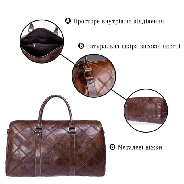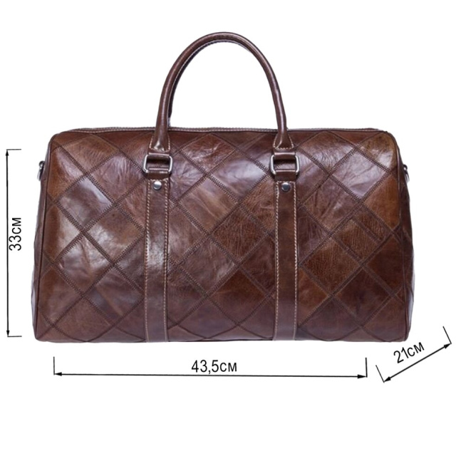 Дуже вмістка і зручна дорожня сумка. Відмінно підійде в зал. На лицевій стороні сумка прошита коричневою ниткою. Аксесуар доповнено фурнітурою сріблястого кольору з міцного металу. Внизу сумки є металеві ніжки. Сумку можна носити як в руках, є 2 шкіряні ручки, так і на плечі за допомогою ременя. Ідеальний варіант для стильних чоловіків і жінок. Сумка буде прекрасним подарунком для близької людини. Модель упакована в тканинної чохол.