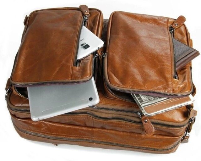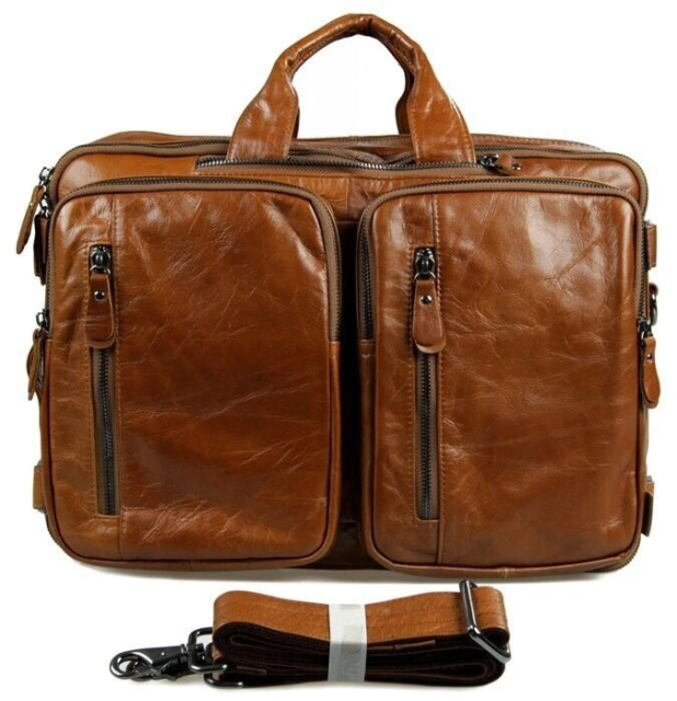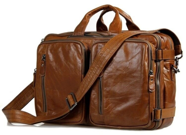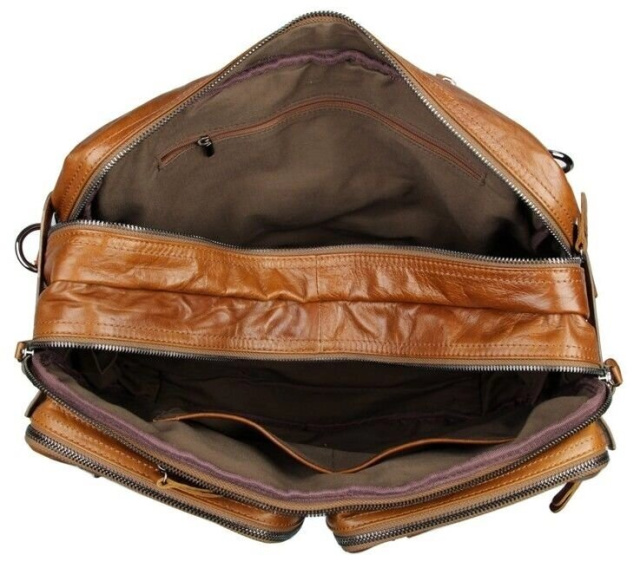 Чудова чоловіча шкіряна сумка-трансформер рудого кольору. Дану модель можна носити в руці, через плече або ж як рюкзак. Колір фурнітури: темне срібло. На лицевій стороні виробу знаходиться 4 відділення на блискавці. Передбачено спеціальні кишеньки на блискавці в які можна ховати шкіряні ручки. Сумка упакована в текстильний пилозахисний чохол білого кольору.