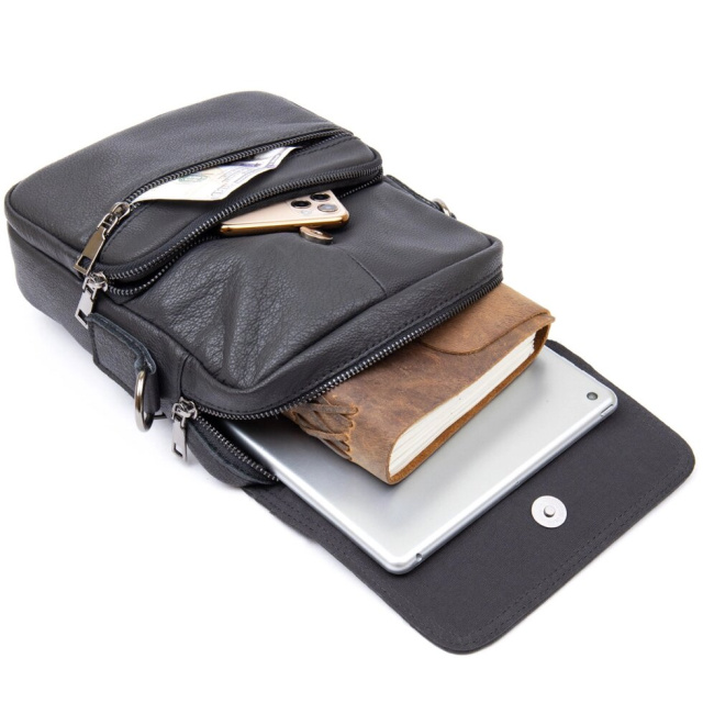 Вертикальна сумка з м'якої шкіри для чоловіків. Виріб стане просто знахідкою для чоловіків. Дизайн сумки продуманий до дрібниць і виглядає дуже солідно і стильно. Сумка доповнена якісною фурнітурою. Доповнена модель текстильним регульованим ремінцем. Закривається на блискавку і клапан. Сумка буде відмінним подарунком для близької людини.