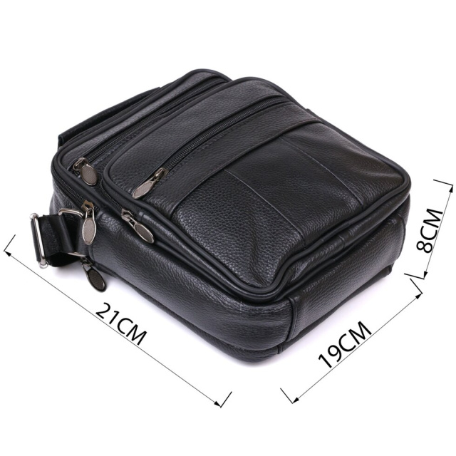Невеликий чоловічий месенджер із високоякісної натуральної шкіри, яка стійка до різних пошкоджень та зносу. Має два місткі відділення та чотири додаткові кишені для різних аксесуарів. Ремінь виконаний із міцного текстилю та регулюється по довжині. Колір виробу - універсальний чорний, що дуже практично і зручно.